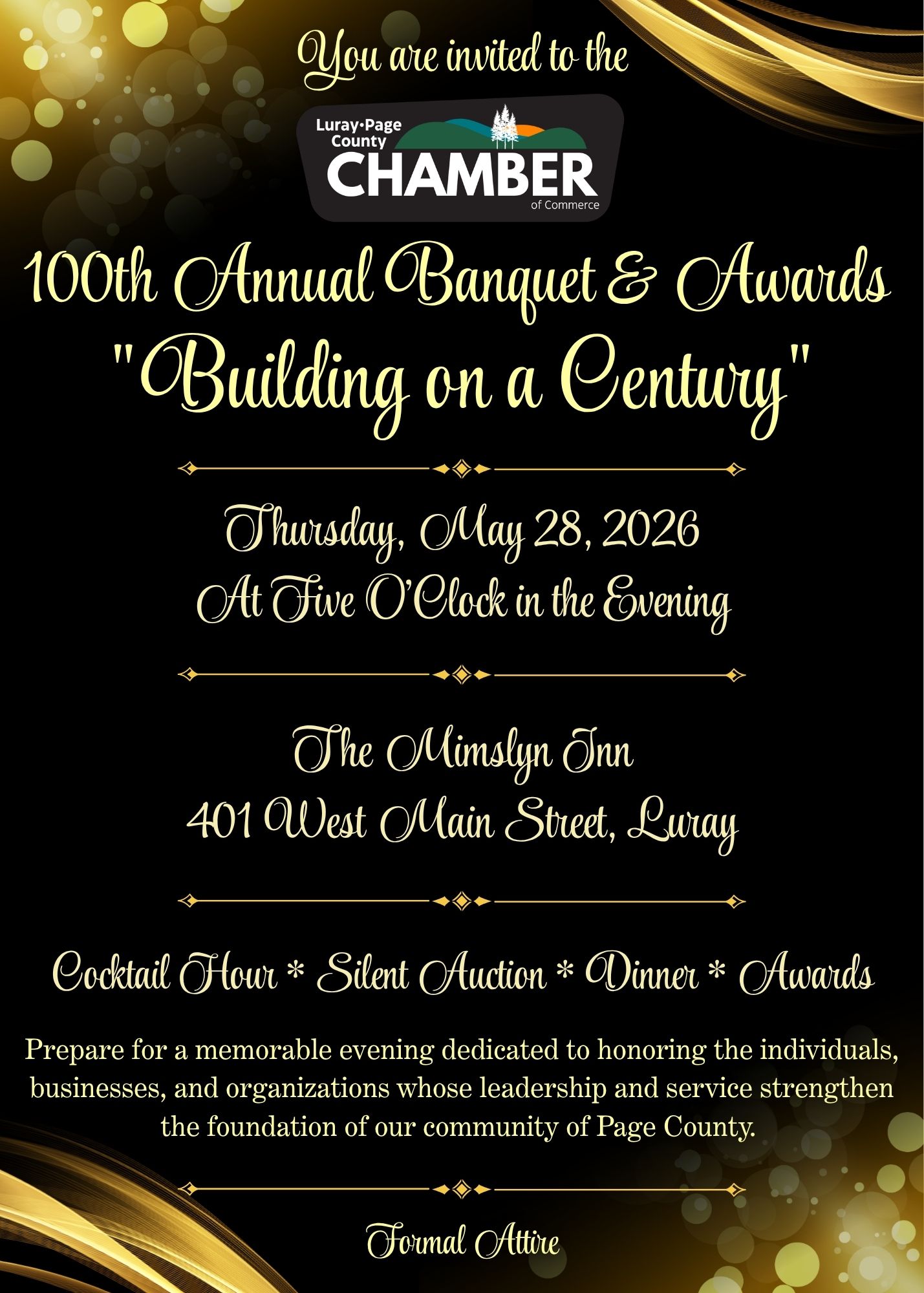 Mark your calendars for our 100th Annual Banquet & Awards — Building on a Century! This milestone celebration will be held at The Mimslyn Inn and promises an unforgettable evening honoring the businesses and volunteers who make Page County thrive.