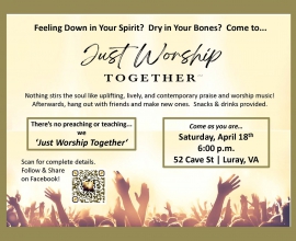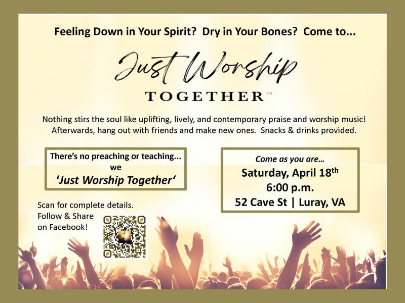 Nothing stirs the soul like uplifting, lively, and contemporary praise and worship music! Afterwards, hang out with friends and make new ones. Snacks & drinks provided. There's no preaching or teaching…. we “Just Worship Together” ™. Visit Facebook.com/JustWorshipTogether for complete details of our next event !